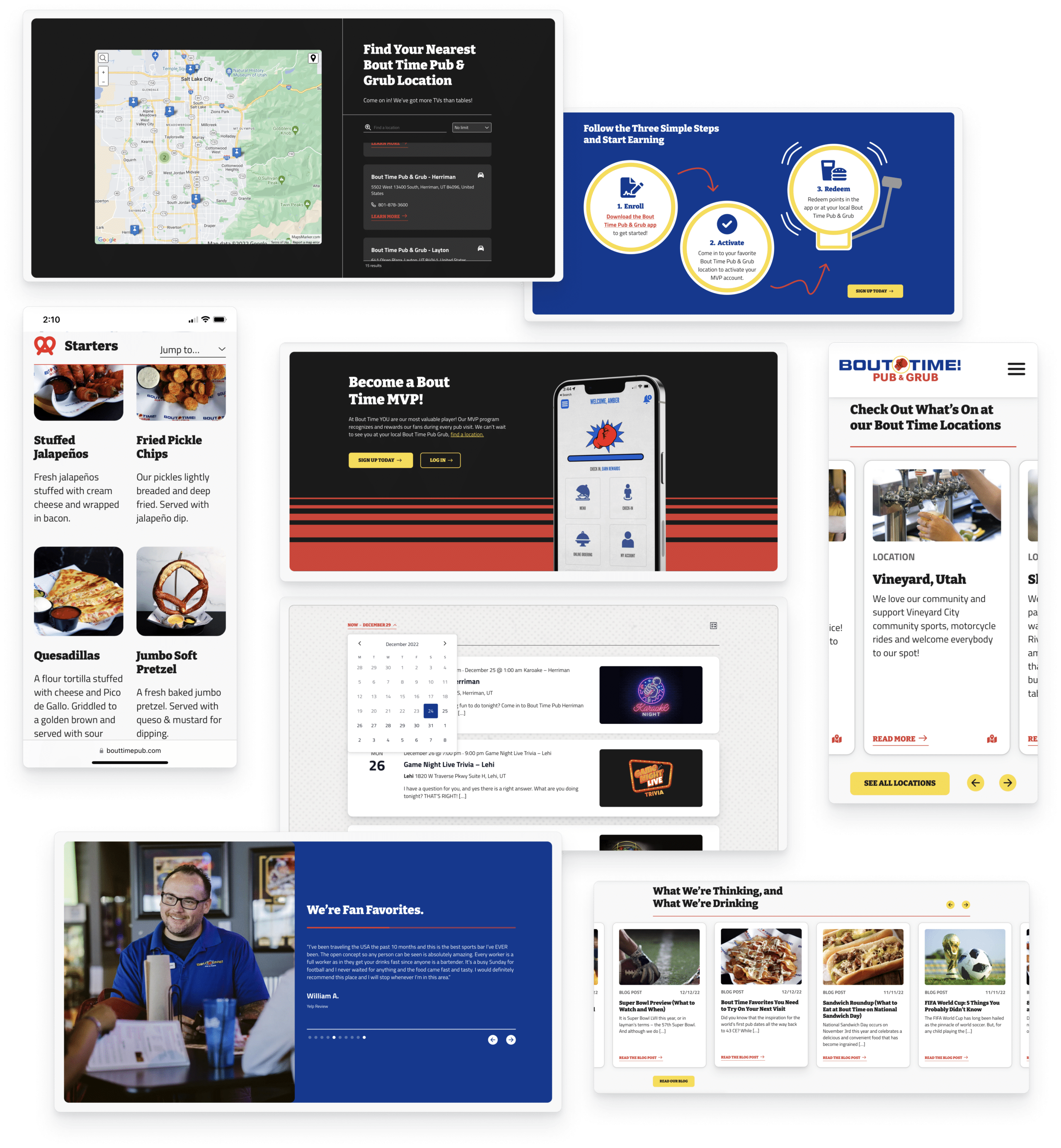 Bout Time Pub & Grub, a sports bar & restaurant chain with 17 locations in Utah and Colorado, embarked on a journey to modernize their brand identity and online presence. My collaboration with Bout Time Pub & Grub began in April 2022 when they partnered with Anchor & Alpine, the agency I work for, to design and develop a new website and rebrand their logo. Our shared objective was to bring Bout Time into the modern era, transforming their outdated website into a robust platform capable of handling increased traffic and demand from their customer base. My role as Lead UX Designer allowed me to guide the project from research and wireframing to visual design, QA, and its successful launch.