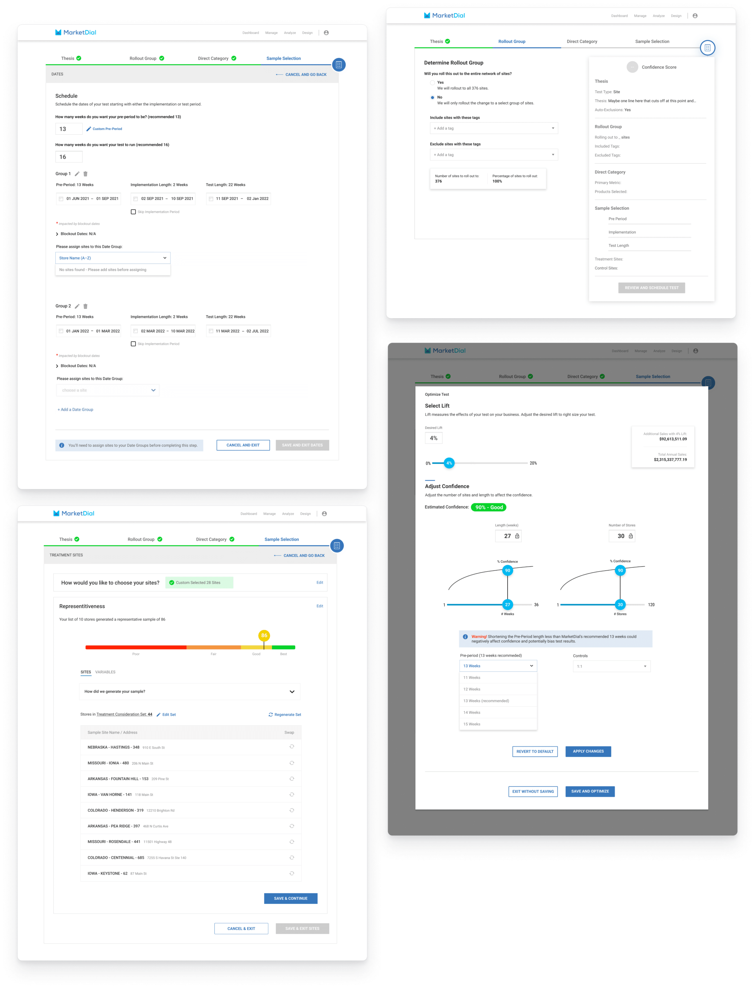 My work on MarketDial’s product primarily revolved around two key features: the “Test Building Wizard” and the “Lift Explorer.” The Test Building Wizard serves as the gateway to MarketDial’s product, allowing users to create tests for a selection of their stores. This feature guides users through designing experiments, including selecting locations, products, and controls. I collaborated extensively with MarketDial’s product manager, lead data scientist, and developers to improve the user experience and overhaul UI elements that had been implemented without design guidance. Research, user interviews, and the creation of detailed product maps and user personas laid the foundation for these improvements.