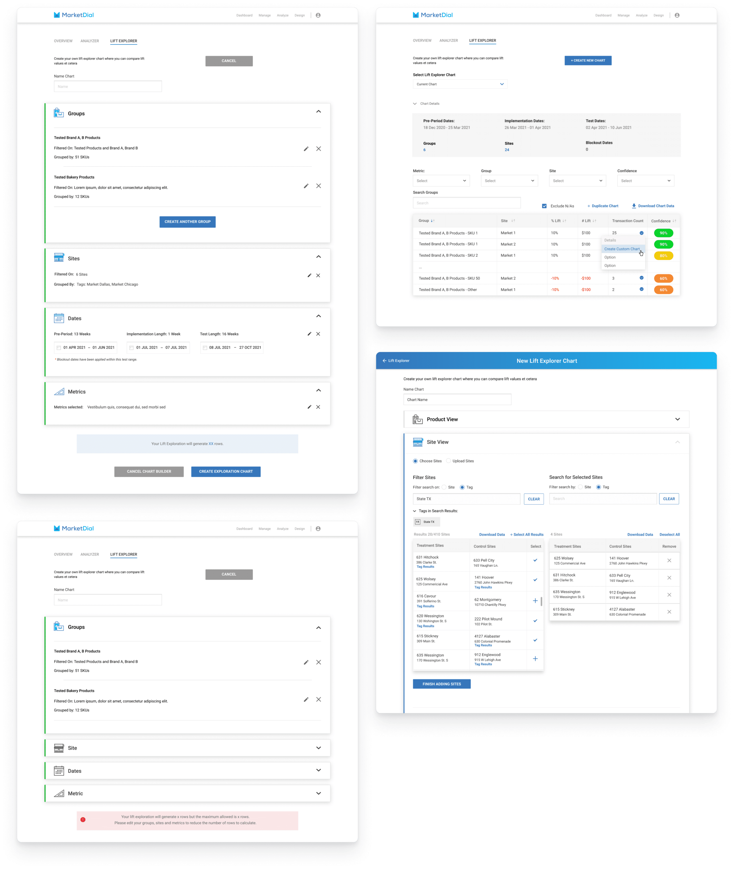 I also designed the “Lift Explorer” feature from the ground up, conceptualizing a comparative chart builder that MarketDial customers had long requested. This feature enables users to explore how different variables affect the revenue lift generated by their retail tests. The feature was meticulously developed, tested, and launched, offering a vital tool for MarketDial customers.