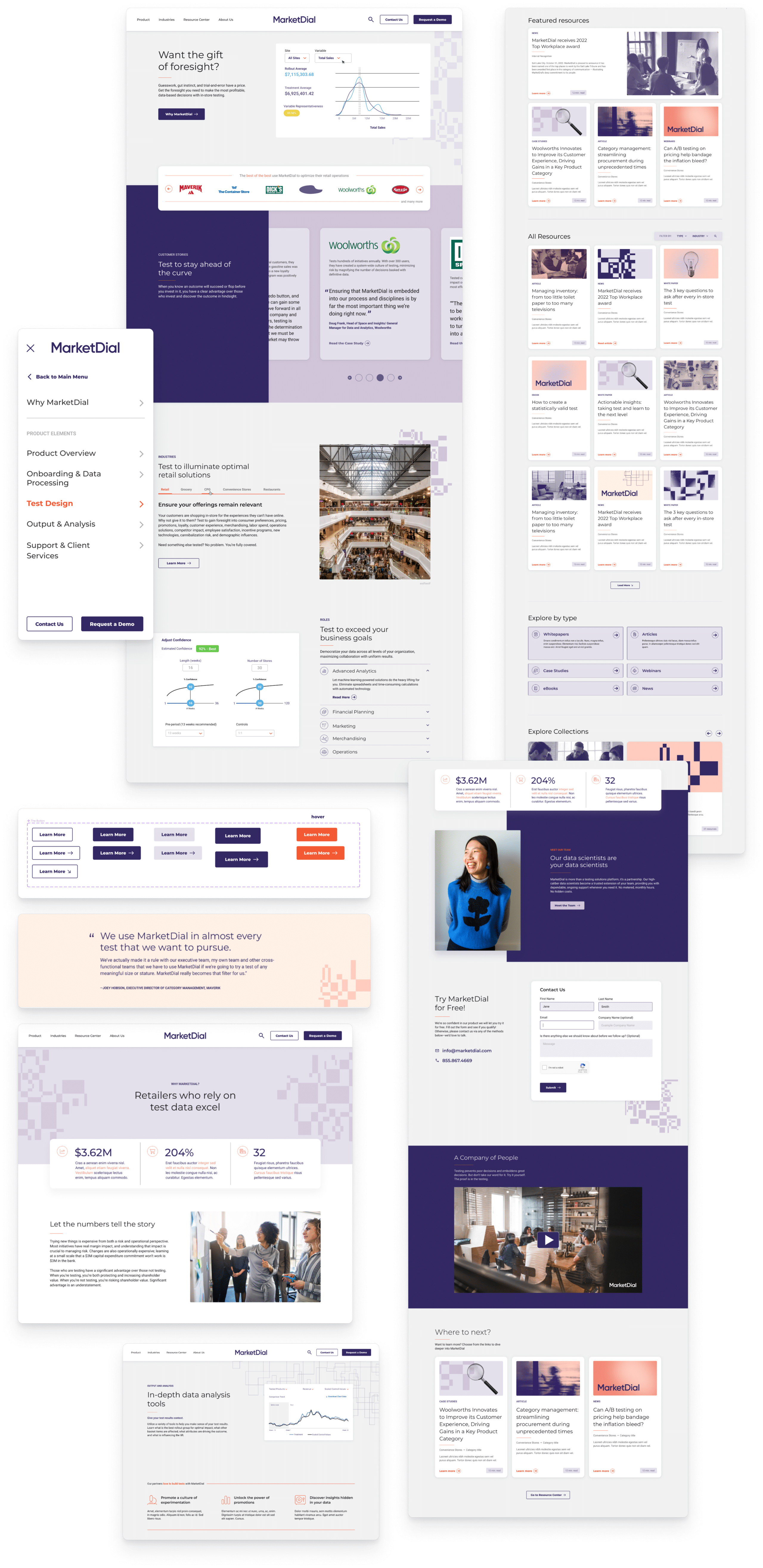 Before commencing the design, our approach included in-depth UX interviews with MarketDial’s customers, helping us gather valuable insights to inform the new site. The uniqueness of this website launch lay in the incorporation of testing different homepages that I designed, aligning with MarketDial’s core value of data-driven decision-making. This approach allowed MarketDial to practice what they preach by testing various messaging and graphics to optimize their website for the most positive impact.