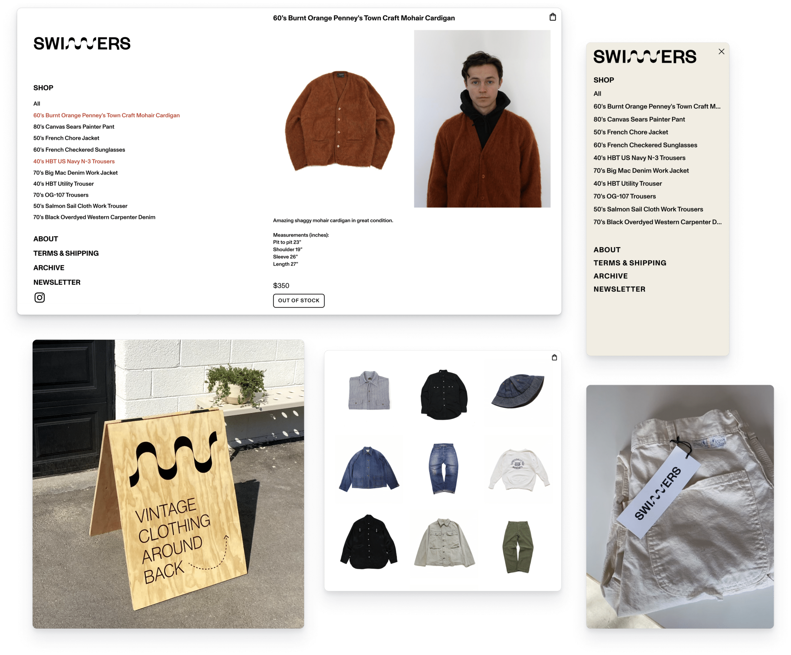 The website design allows users to shop in various ways, aligning with SWIMMERS’ unique product release schedule. Users can choose to click on individual items from the homepage list, view all items in a grid, or navigate through the entire collection sequentially by selecting a single item. This flexibility empowers SWIMMERS to effectively engage their audience and showcase their vintage offerings.