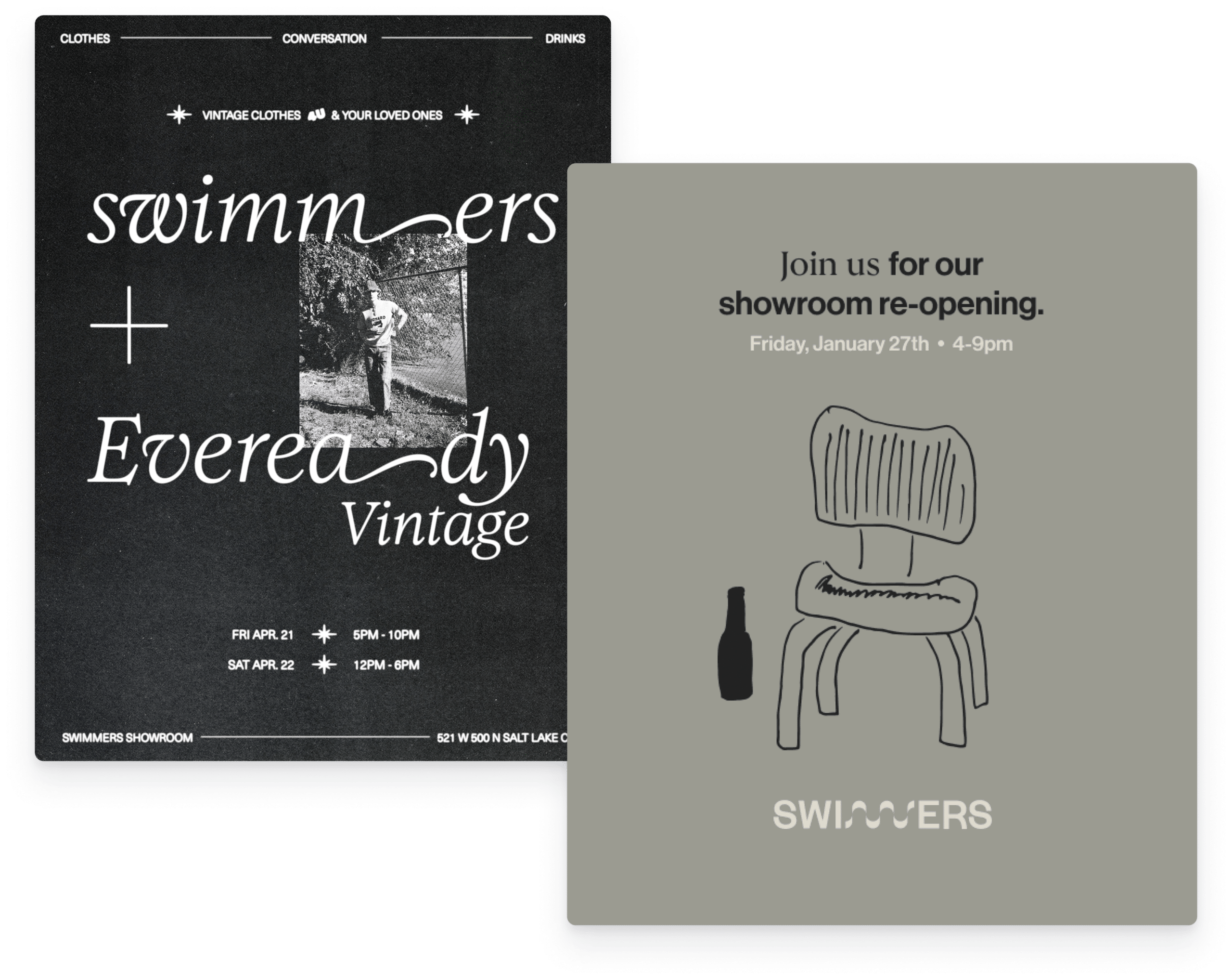 Beyond the online shop, our collaboration extended to a range of graphic design projects that reinforced SWIMMERS’ brand identity. I created window graphics for the storefront, an A-frame sign to attract passersby, event posters to capture the essence of their vintage pop-up events, and even the hang tags, all of which are subtle yet essential components of their brand identity.