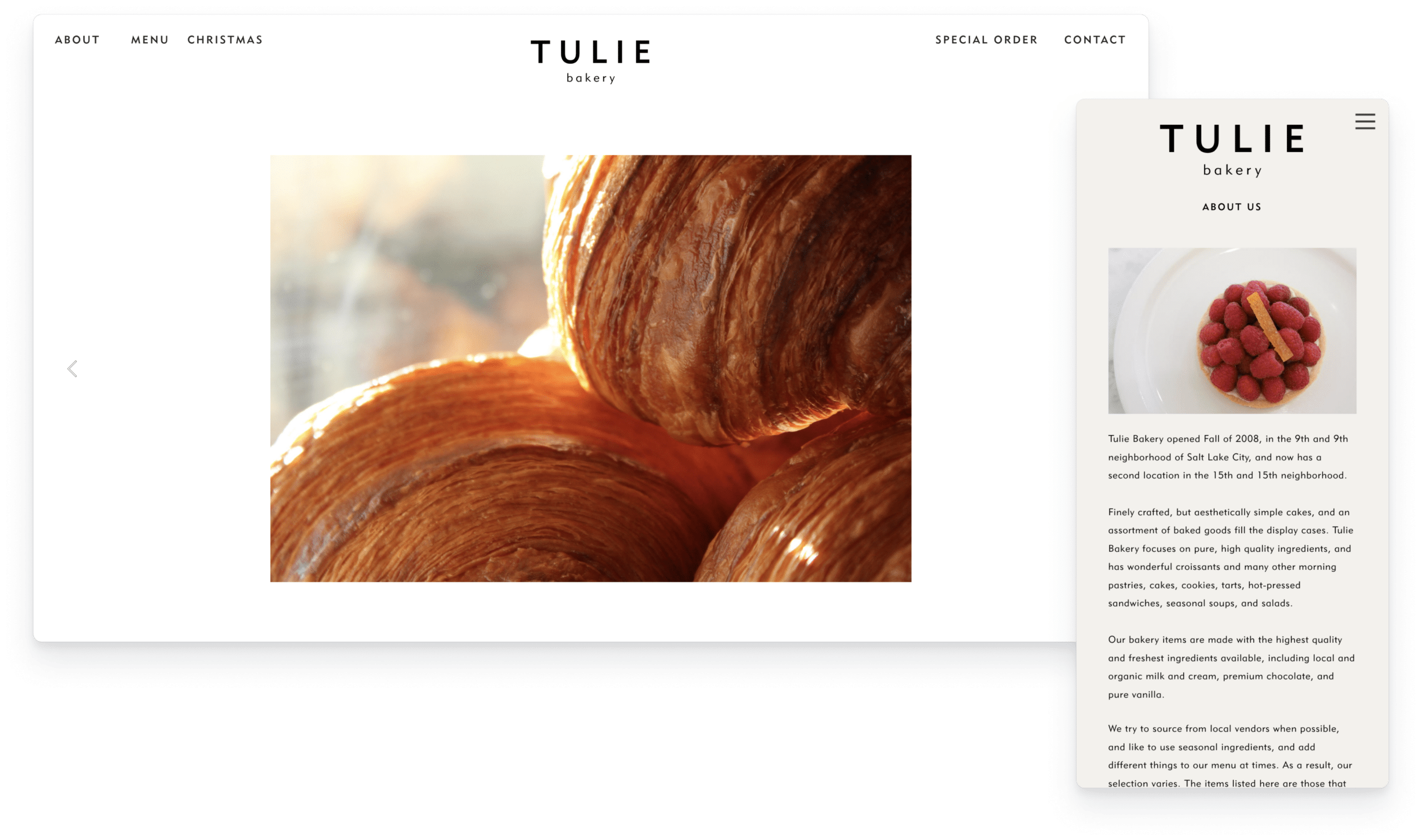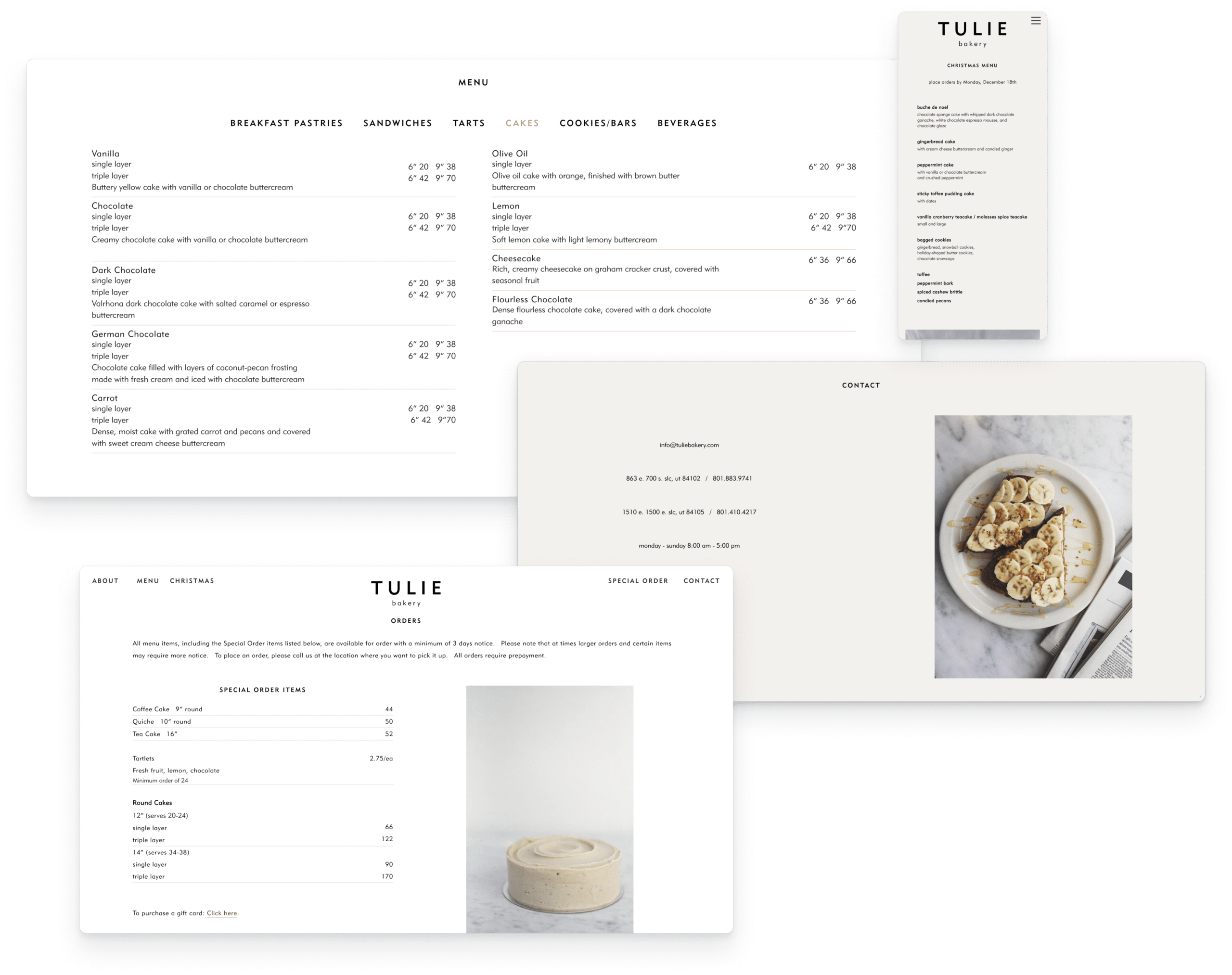 Tulie Bakery, a renowned bakery with two Salt Lake City locations, enlisted my services in 2020. The founder, Leslie Seggar, contracted me to redesign their website in collaboration with freelance developers from Team Five Three. Our primary goal was to create an elegant and easily updatable website that could accommodate changes in the menu, policies, and seasonal offerings. Known for its meticulous aesthetic, both in physical spaces and product presentation, Tulie Bakery required a website that matched its minimalistic refinement and sophistication.