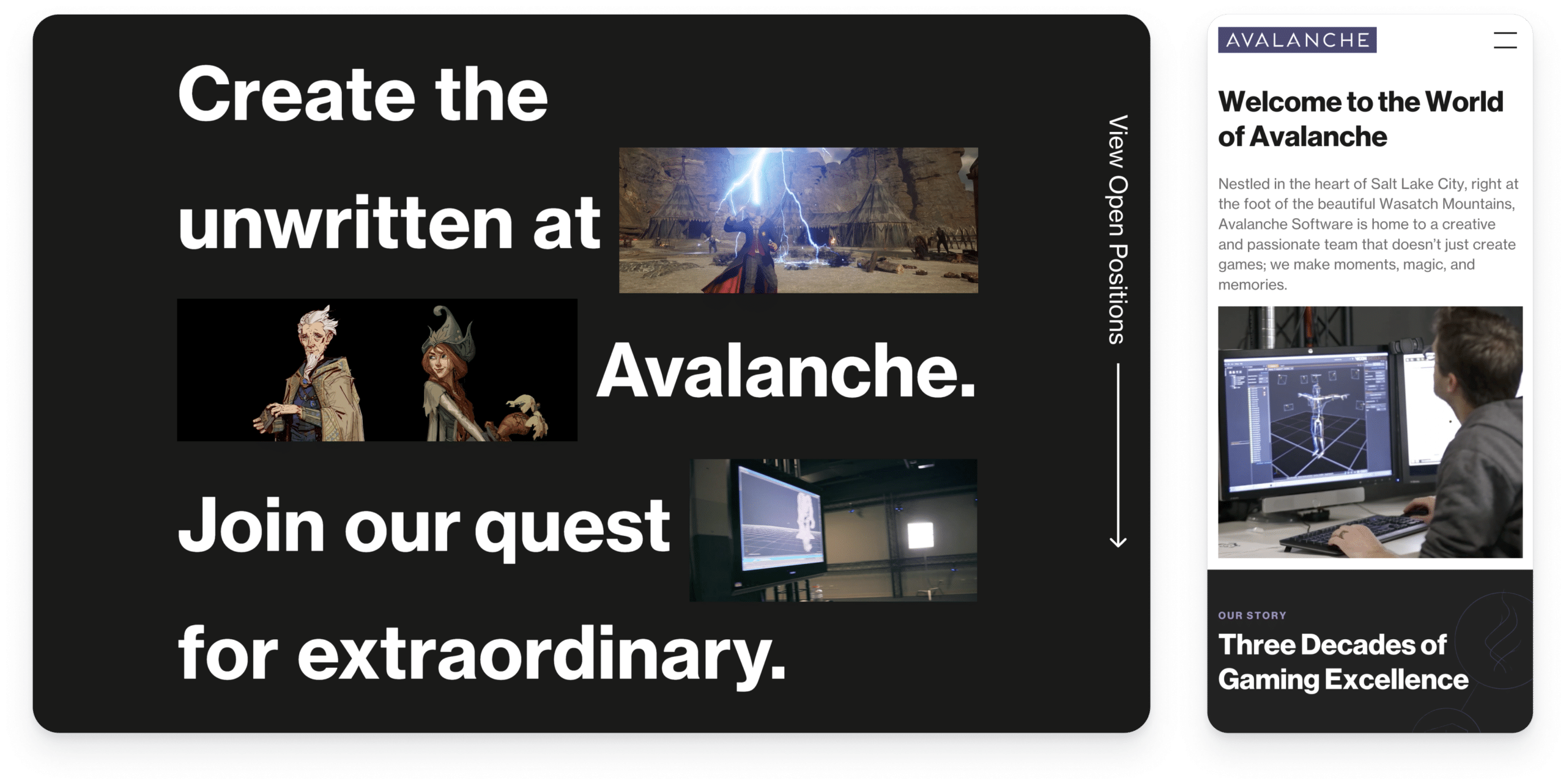 Result: The redesigned website is more than just a portfolio—it’s a digital extension of Avalanche’s studio identity. It’s helped them showcase their work in a way that feels authentic while also serving as a powerful tool for recruitment and fan engagement. Collaborating on this project was incredibly rewarding, blending imagination and usability to create something Avalanche is excited to share with the world.