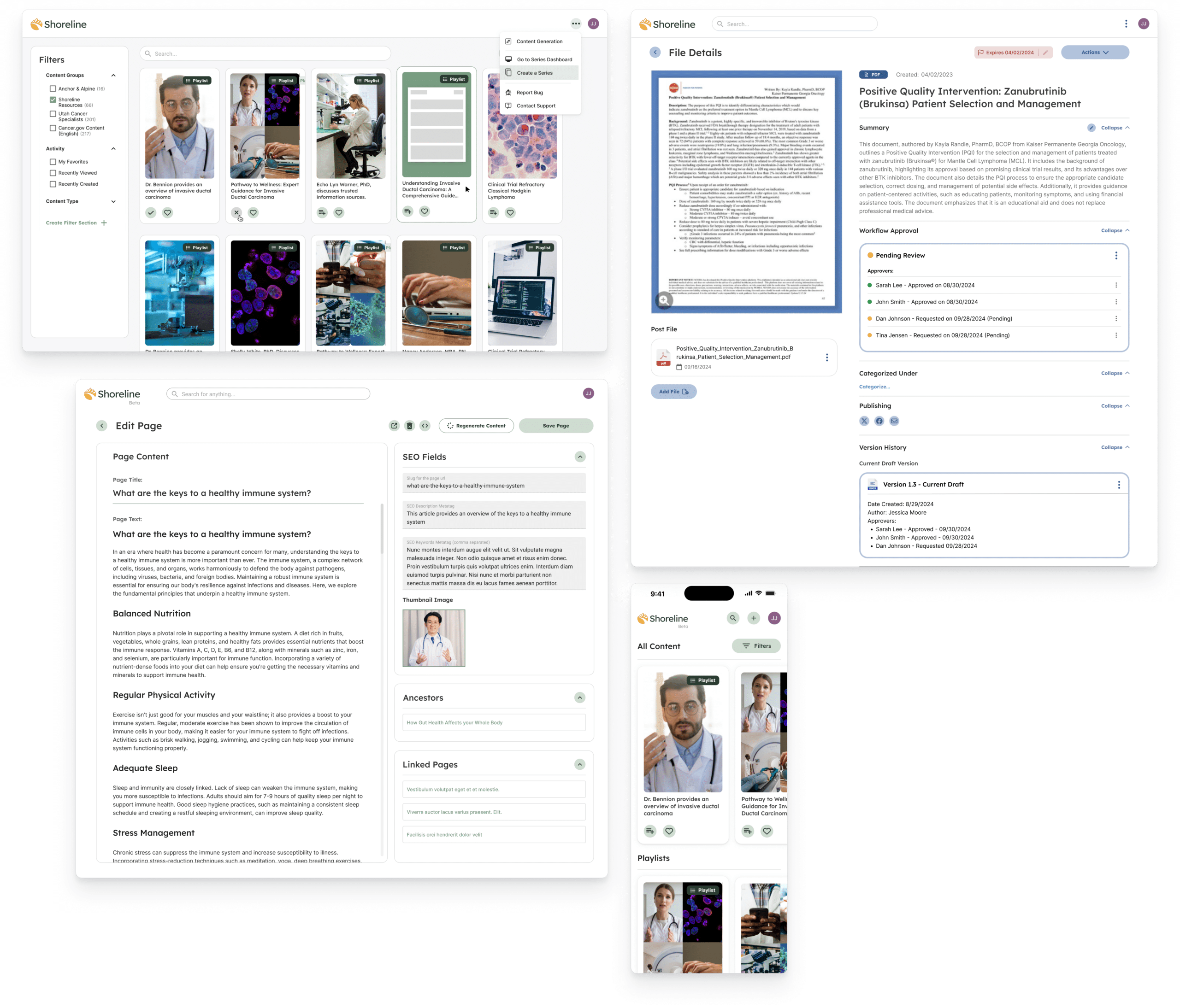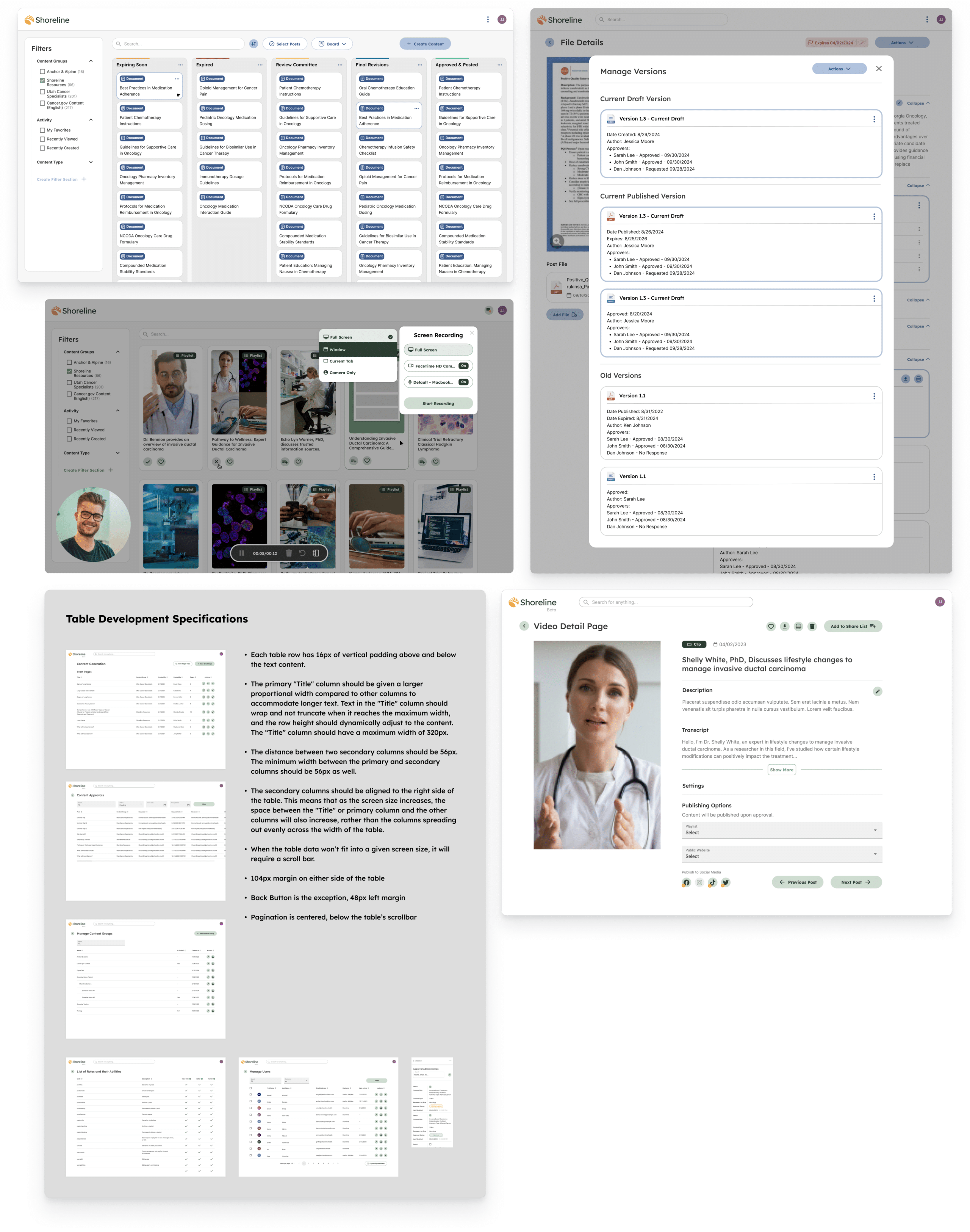 As a UX/UI designer at Anchor & Alpine, I’ve played a pivotal role in shaping the comprehensive design of Shoreline Health’s patient education system. Our objective was to craft an intuitive and effective content hub tailored to the unique needs of oncology clinicians and their patients. Working alongside my fellow UX/UI designer, we collaborated closely with Shoreline Health’s founder and lead developer, dedicated to establishing the user experience, designing user flows, and crafting an engaging user interface.