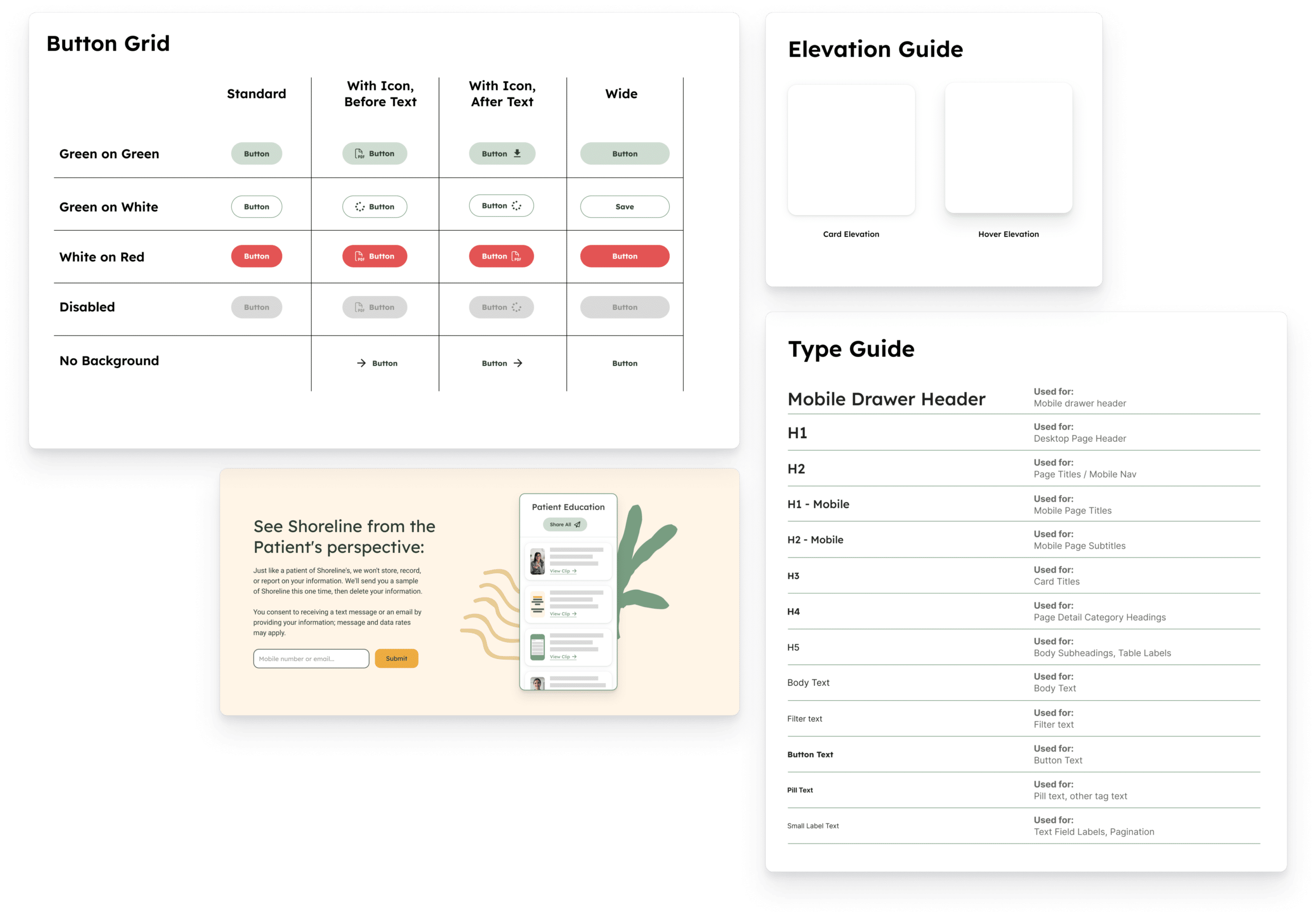 Our project commenced with the creation of a bespoke design system, carefully tailored to Shoreline Health’s specific requirements. Leveraging the MUI React components as our foundation, we thoroughly customized them, ensuring seamless integration while preserving the platform’s distinctive identity. My responsibilities included defining type styles, establishing a hierarchy, and crafting a visually harmonious user interface.