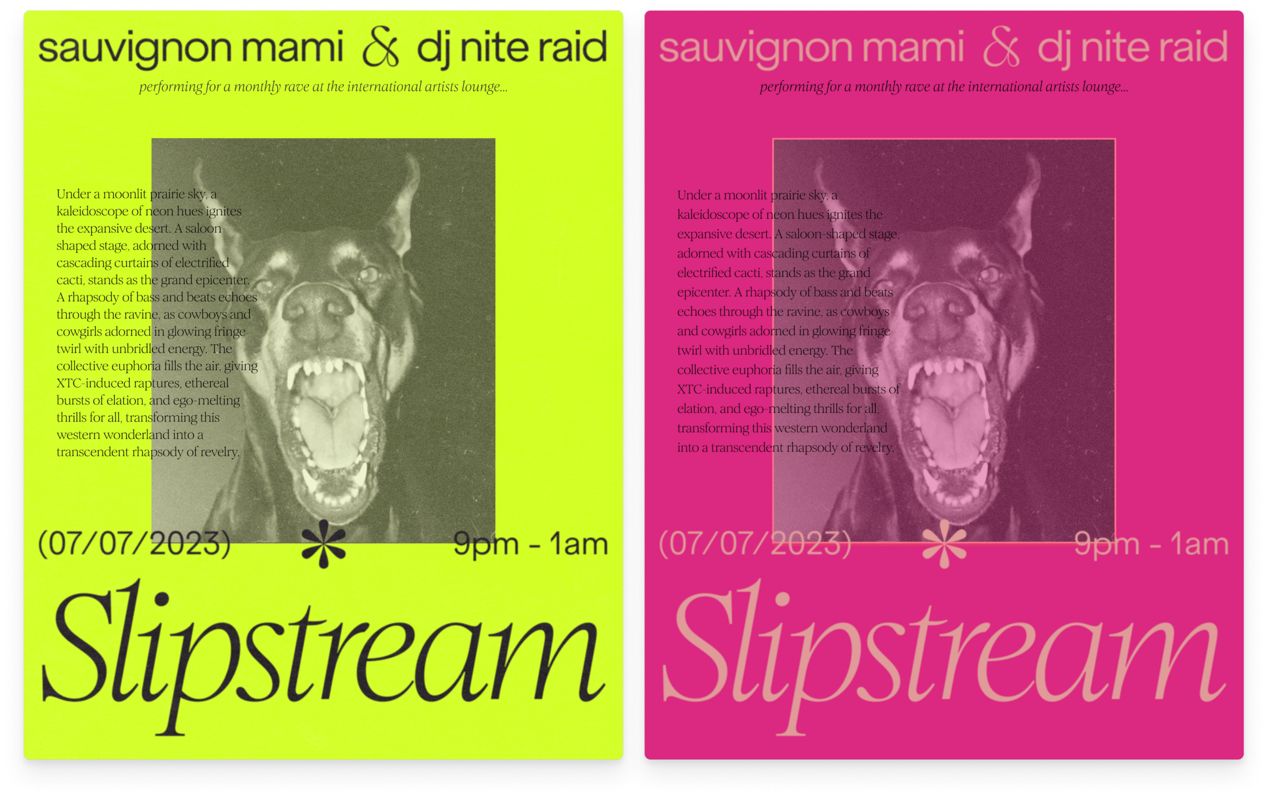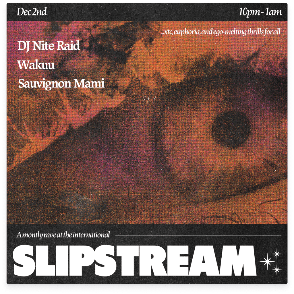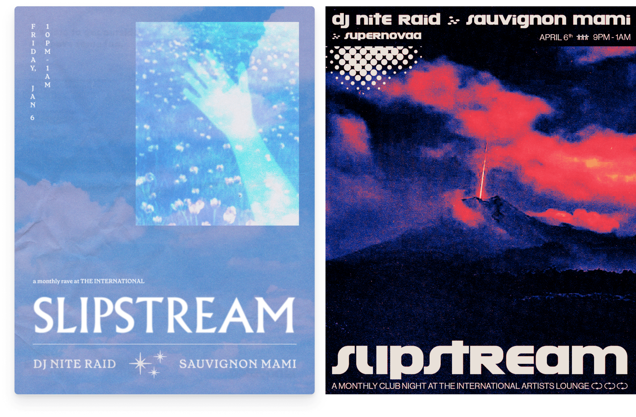 Since 2022, I’ve been designing flyers for Slipstream, a monthly dance and house music night hosted by DJs Sauvignon Mami and DJ Nite Raid at the International Artists Lounge in Salt Lake City, UT. This ongoing project has allowed me to explore a variety of graphic styles while staying true to the high-energy, euphoric spirit of the event.